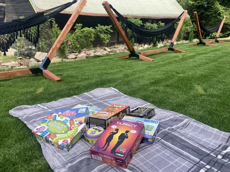 W każdym domków znajduje się duży taras z meblami ogrodowymi i grillem oraz balkon z leżakami.